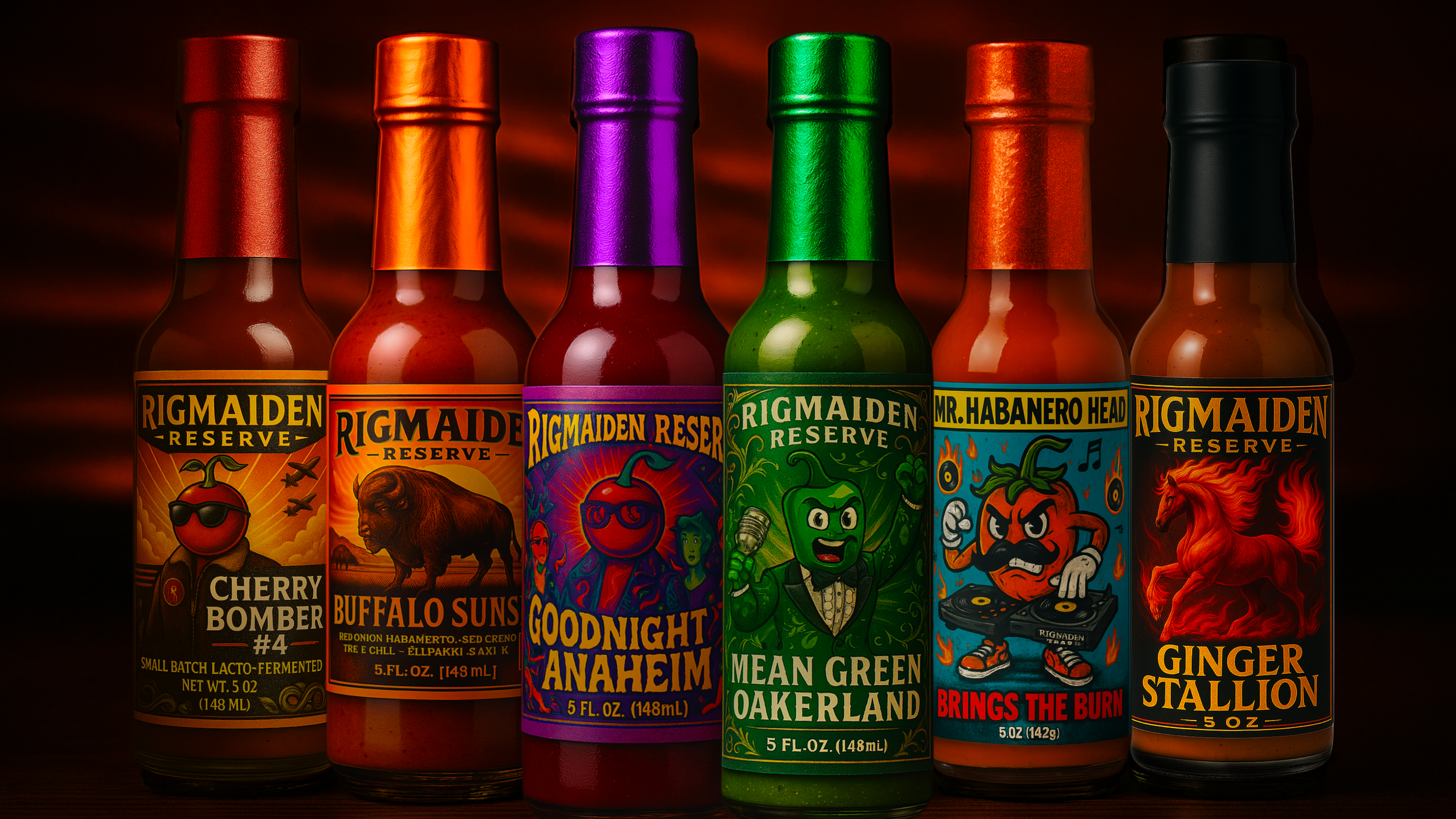Includes the full Scoville Sampler Box (4x 100mL bottles) featuring core-character sauces like Cherry Bomber, Mr. Habanero Head, Buffalo Sunset, and more.
